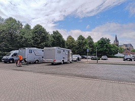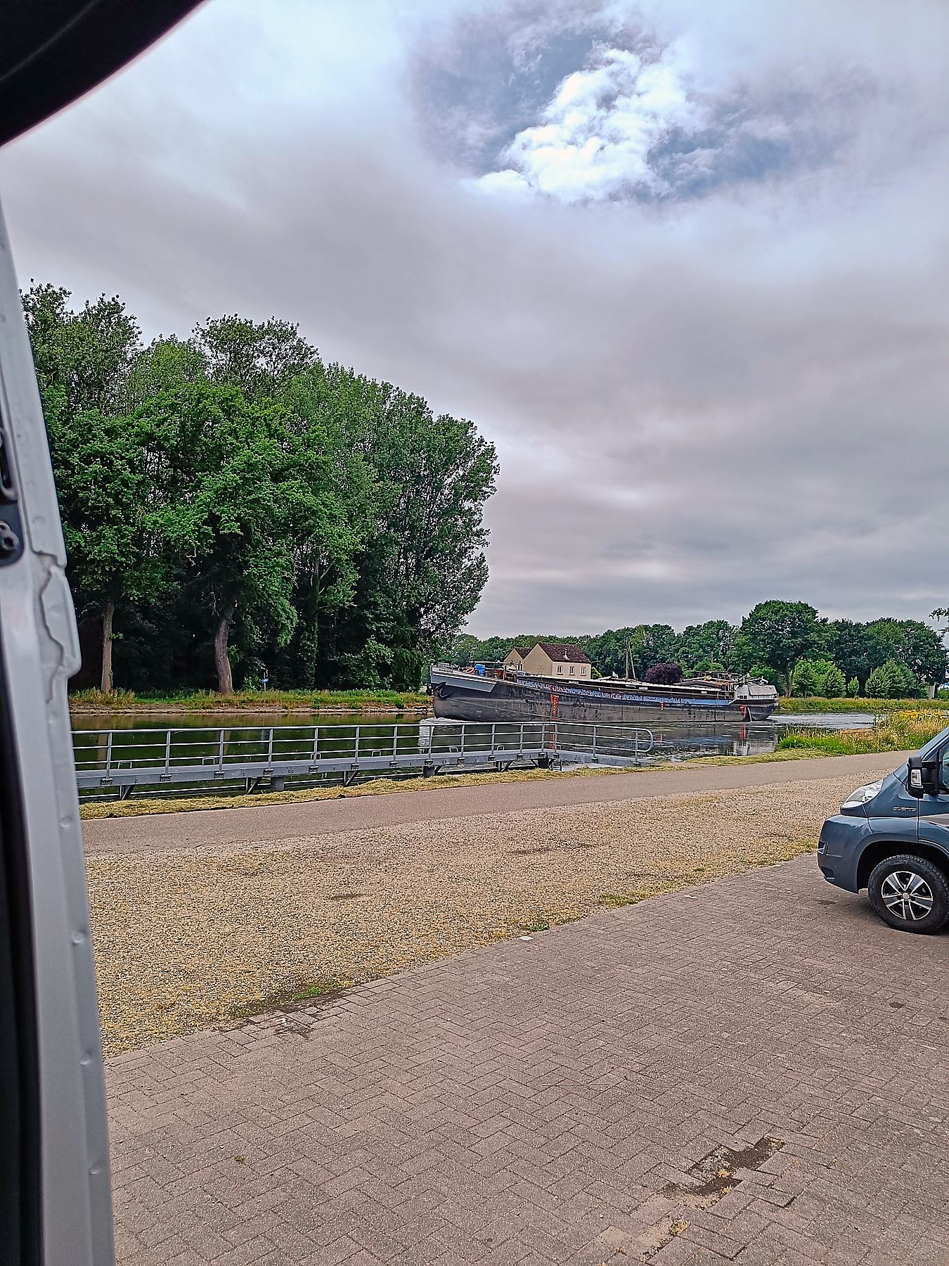 Danach: Weiterfahrt zum Stellplatz De Kiper am Kanal – kostenfrei, mit V+E und ideal für Radfahrer. Kurze Pause, Mittagessen und dann auf nach Thorn in den Niederlanden, wo wir wieder auf einem Parkplatz-Stellplatz landeten.