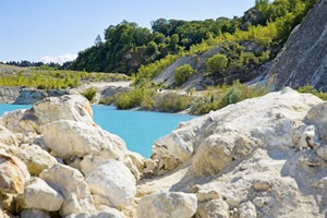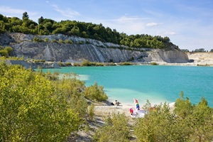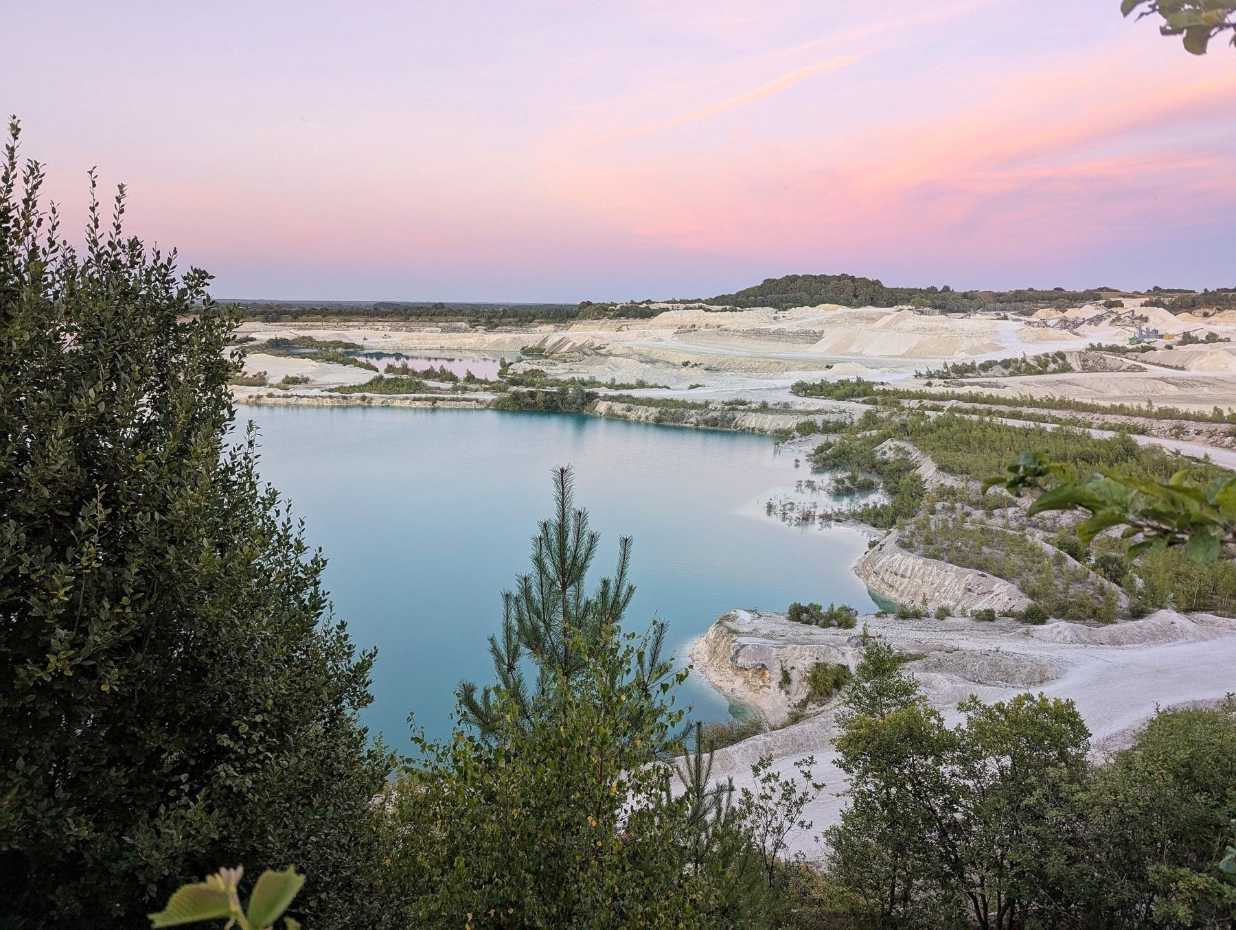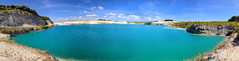 Am frühen Nachmittag suchten wir in Faxe beim Visitor Center vergeblich nach einem Parkplatz, fanden aber schließlich einen am Rand der Kalkgruben. Wir spazierten durch die riesige Kalkgrube und bestaunten das karibikfarbene Wasser der Kalkseen.
