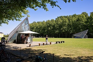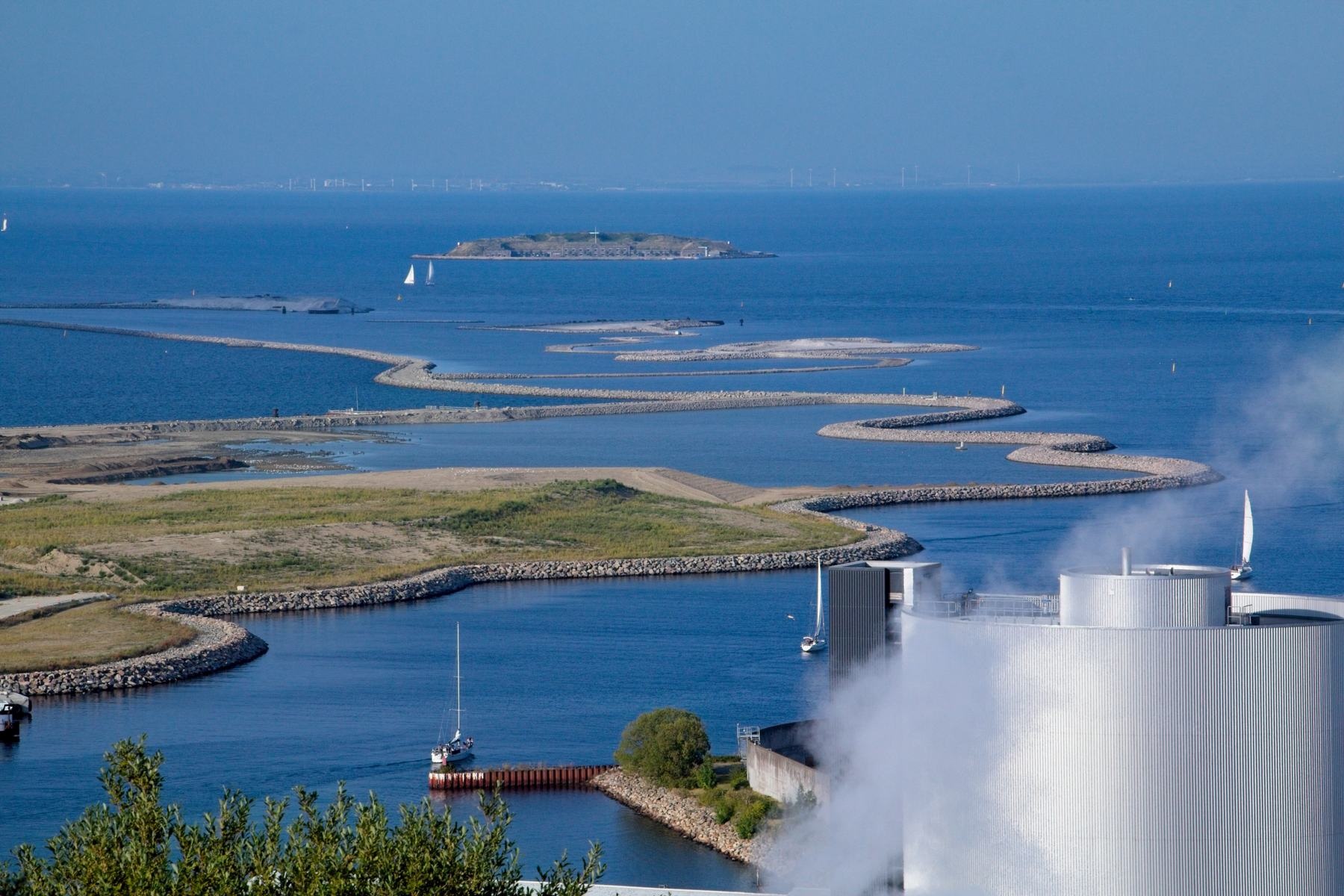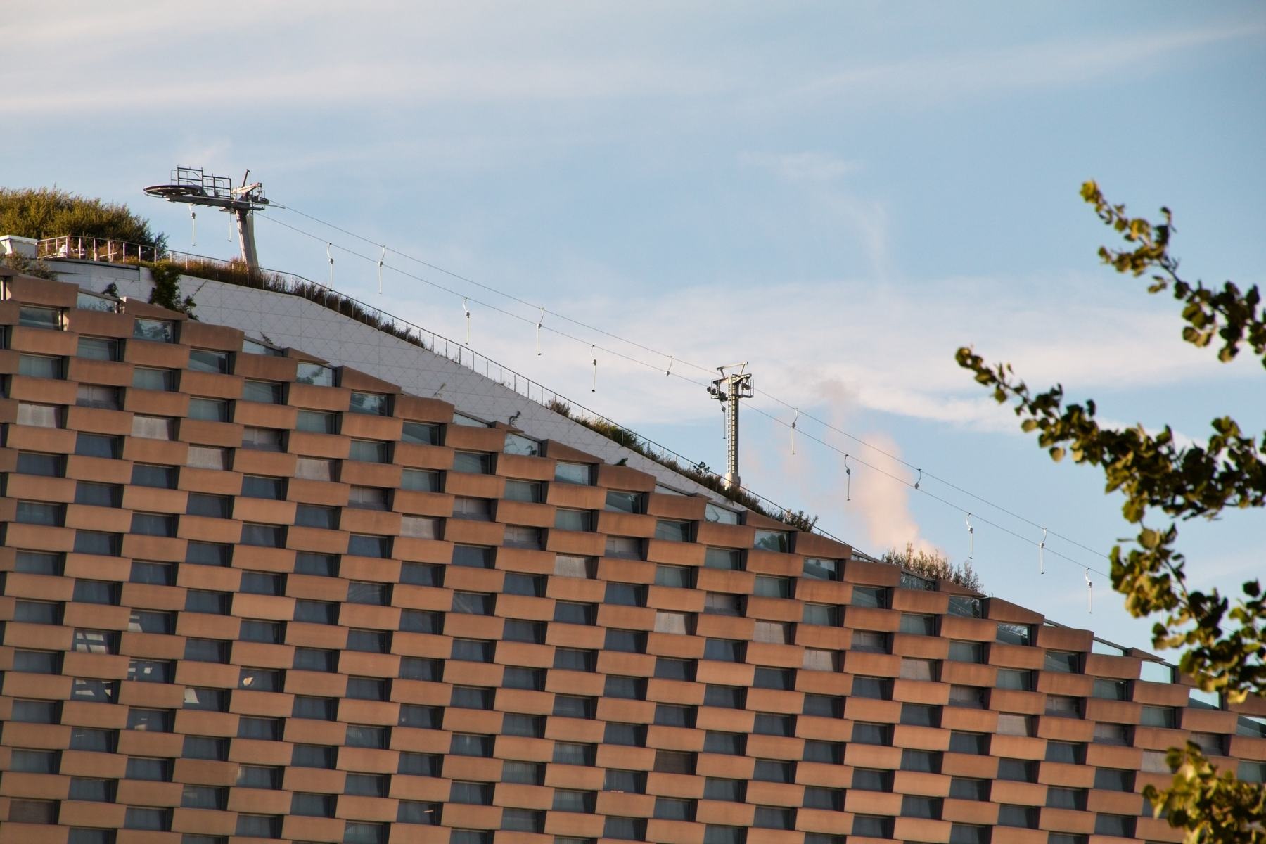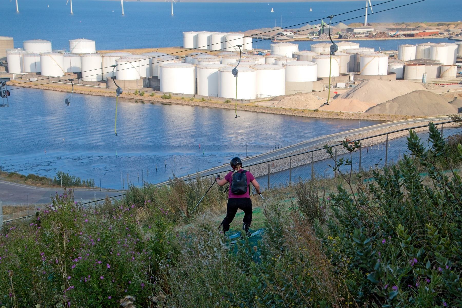 Mit den Rädern fuhren wir zur Müllverbrennungsanlage, wo wir den kostenlosen Lift zum Dach nahmen. Dort gaibt es einen Schilift und einen Klettersteig, der durchgehend von unten bis oben führt. Die Aussicht war großartig – das Zentrum von Kopenhagen war im Sonnenschein allerdings nicht gut zu sehen.