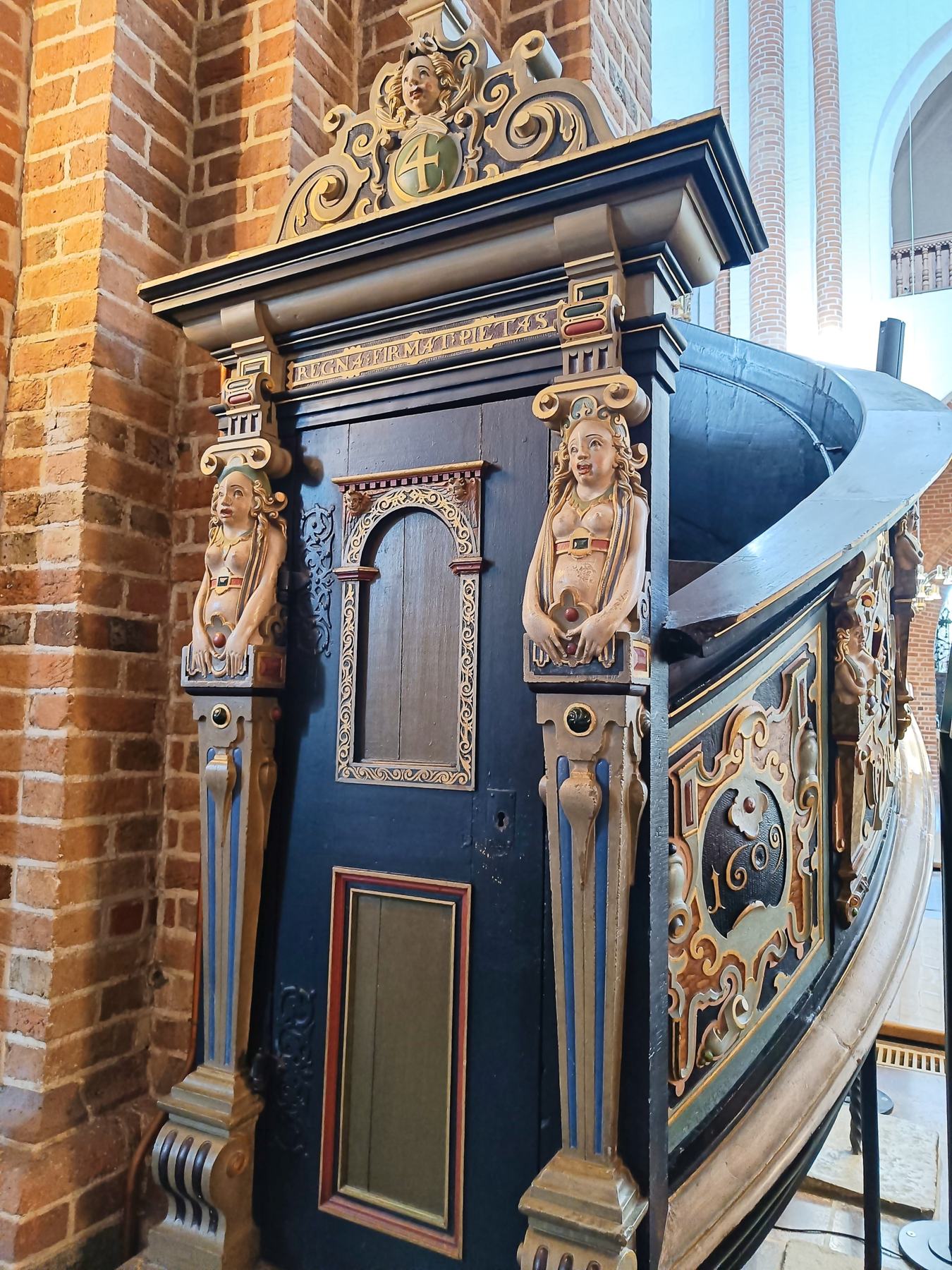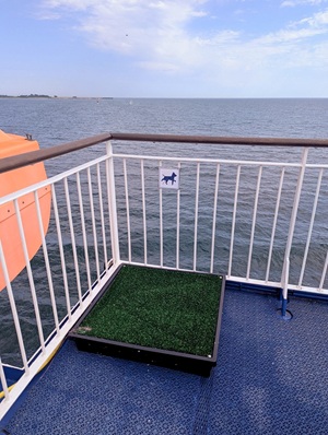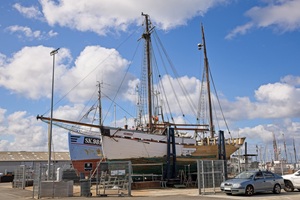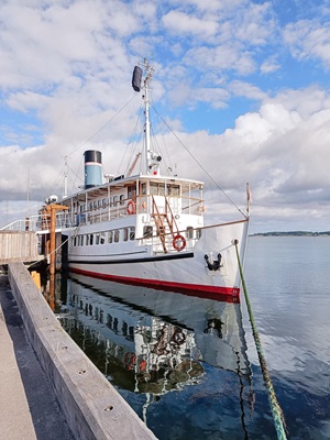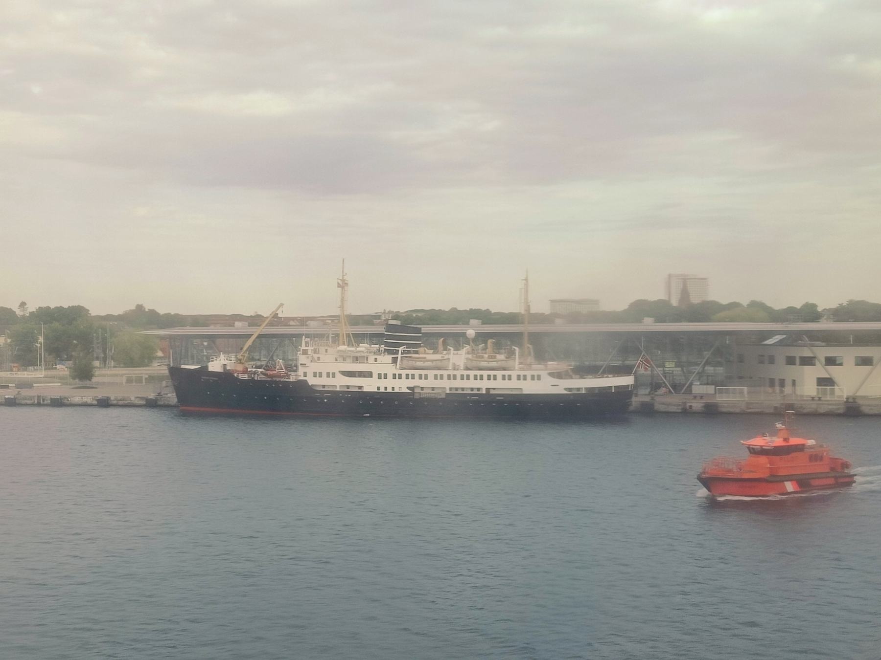 In Gedser konnten wir noch das WC entleeren (Wasser war zwar zum Auffüllen vorhanden, aber der Druck war zu gering), bevor wir zum Fährhafen fuhren. Pünktlich um 6:45 Uhr legte die Fähre ab. Die Überfahrt war ruhig, wir frühstückten mitgebrachtes Gebäck und gönnten uns teuren Kaffee, ehe wir nach etwa zwei Stunden in Rostock ankamen und das alte Hurtigruten-Schiff MS Nordstjernen am Kai sahen.