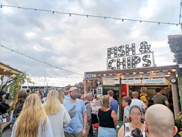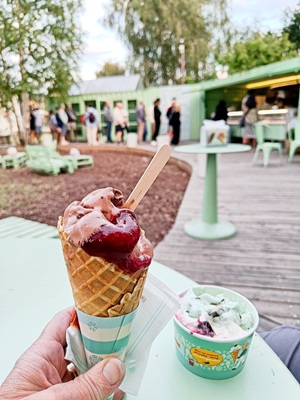 Später fuhren wir weiter zu den Refshalleöen, spazierten das letzte Stück und suchten einen freien Platz. Wir genossen Arancini (Reisbällchen) und Fish and Chips, relaxten in den Strandsesseln und gönnten uns zwei Kugeln eines hervorragenden, aber sündhaft teuren Eises.