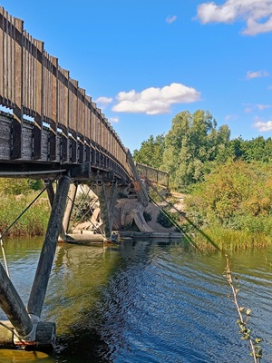 Nach einer Mittagsrast machten wir uns auf den Weg zur Brücke mit den Holzriesen und kamen dabei an einigen Hochlandrindern vorbei (ca. 2,4 km).