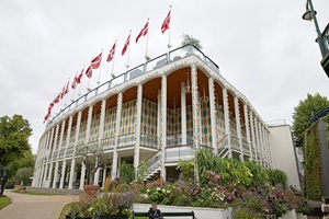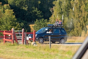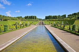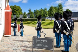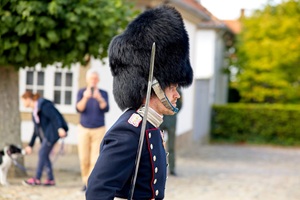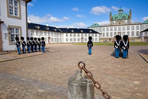 Weiter ging es zum Parkplatz in Fredensborg, von dem das Schloss etwa 1,3 km entfernt war. Wir gingen durch eine Schafweide, gelangten in den Schlosspark und erreichten die Vorderseite von Fredensborg, wo gerade der König residierte.
