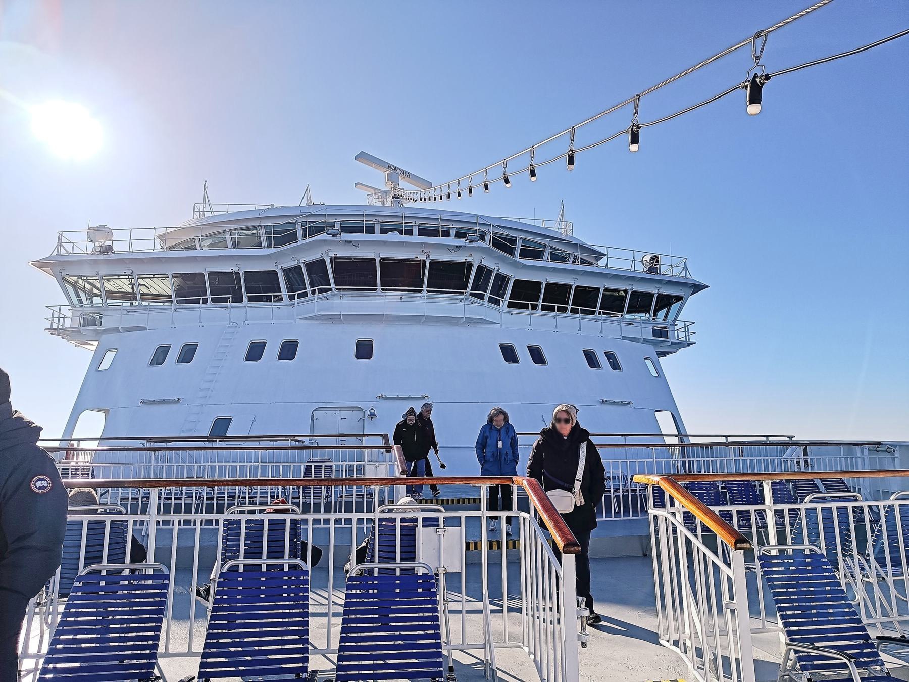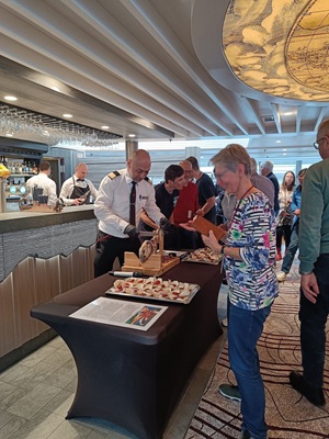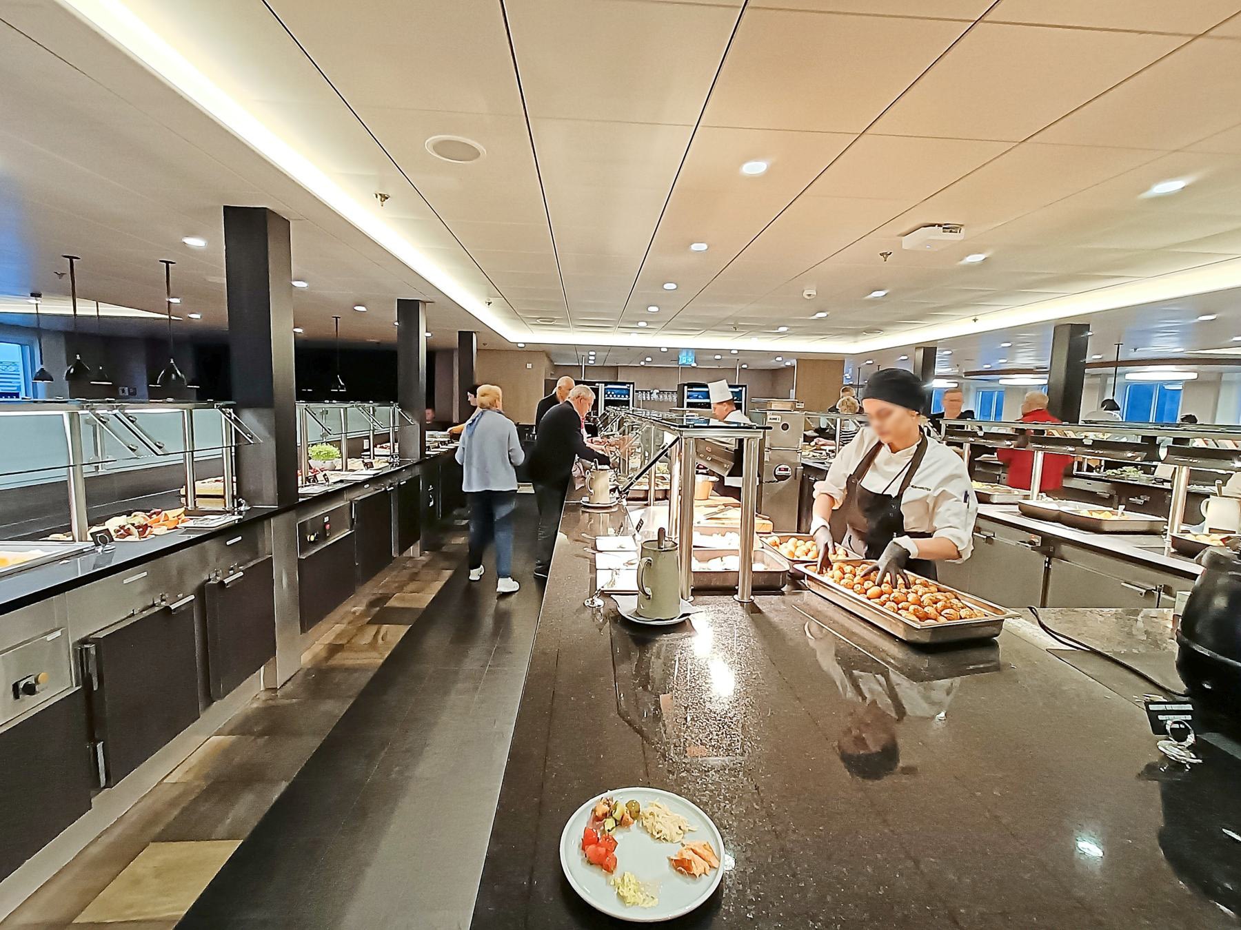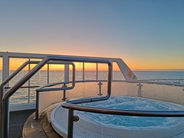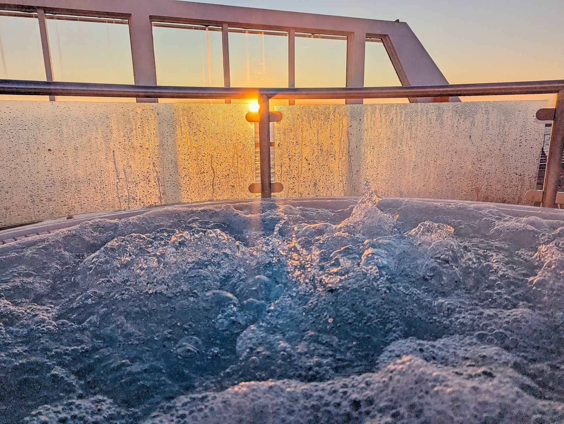 Die Nacht war nicht gerade erholsam. Ab etwa 4 Uhr konnte ich kaum schlafen. Wir holten uns gegen 6 Uhr einen ersten Kaffee und nach einem kurzen Besuch im Fitnessraum, war eine Dusche und ein entspannender Whirlpool genau das Richtige. Nach einem ausgiebigen Frühstück durchstöberten wir das Aktivitätsprogramm und gingen dann zwei Runden um das Deck. Es gab einen Vortrag, der auch im Schiffs-TV übertragen wurde, der uns interessante Einblicke verschaffte. Am Nachmittag sahen wir uns noch ein weiteres Programm an und später am Abend gab es eine willkommene Gelegenheit, den Kapitän und die Crew kennenzulernen. Der Küchenchef stammte übrigens aus Österreich.