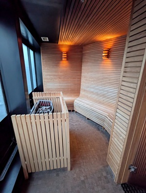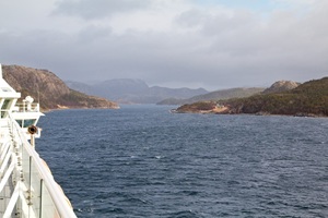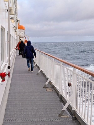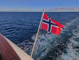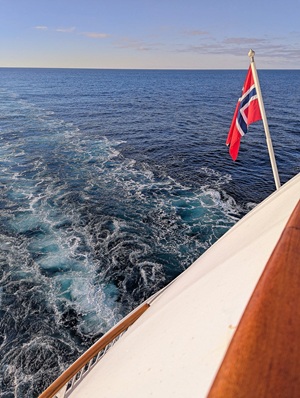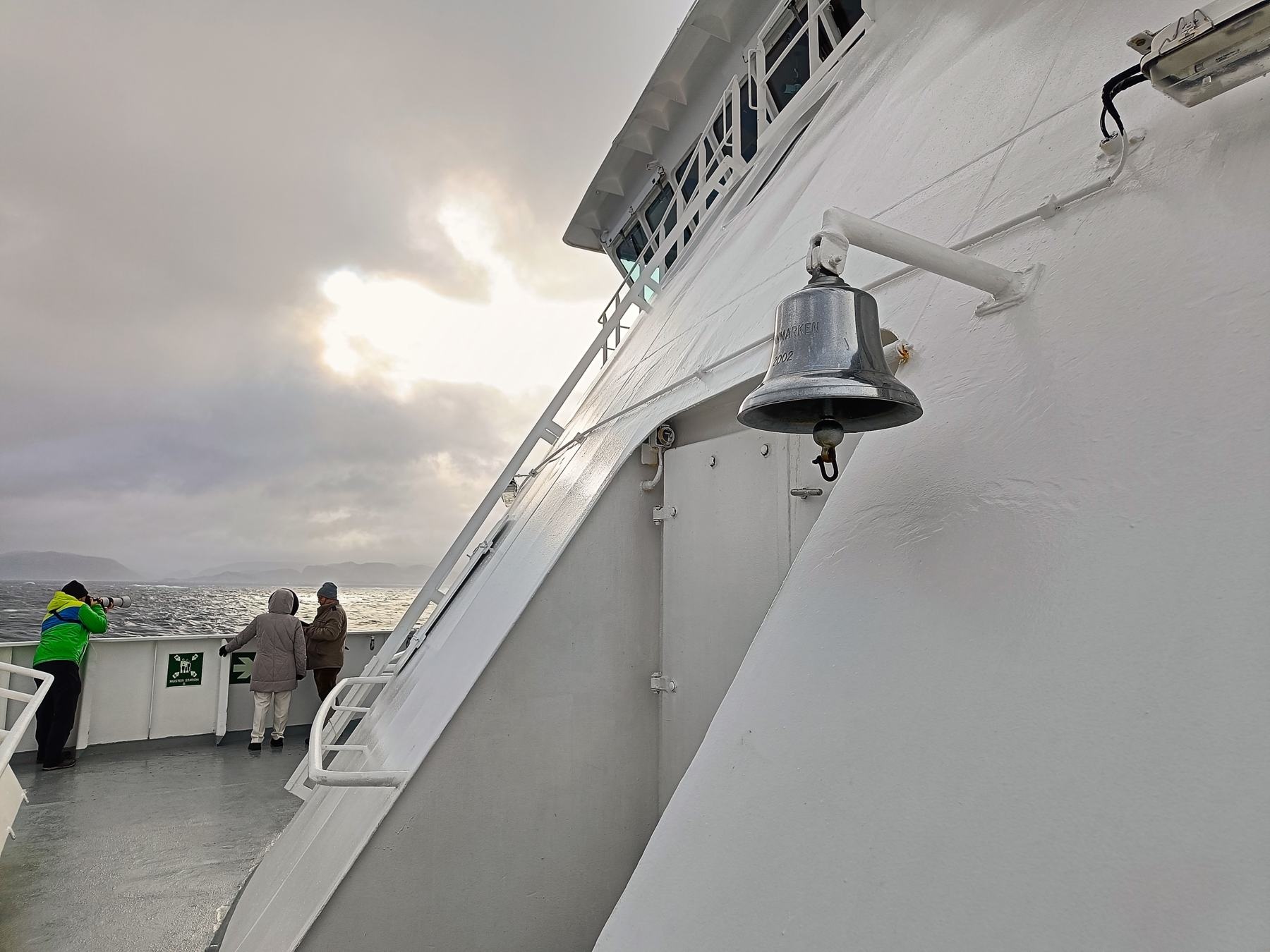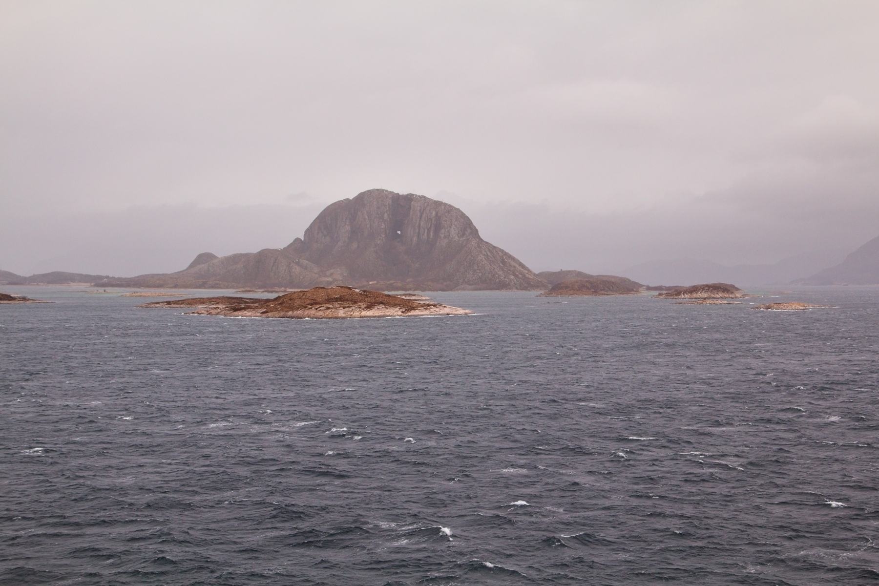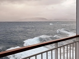 An diesem Tag war ein Seetag angesagt. Früh aufgestanden, Pulver gegen die Seekrankheit eingenommen, und dann ein entspannendes Sauna-Erlebnis bei angenehmen 63 Grad (Aufheizphase, für uns gerade recht). Später genossen wir ein spätes Frühstück. Bis zum Mittag wurden die Wellen ordentlich hoch, aber danach kam die Sonne heraus. Beim Blick auf Torghatten, einem markanten Berg mit einem Loch in der Mitte, konnten wir sogar eine Orca-Flosse erspähen. Am Nachmittag kam wieder starker Wind und Regen auf.